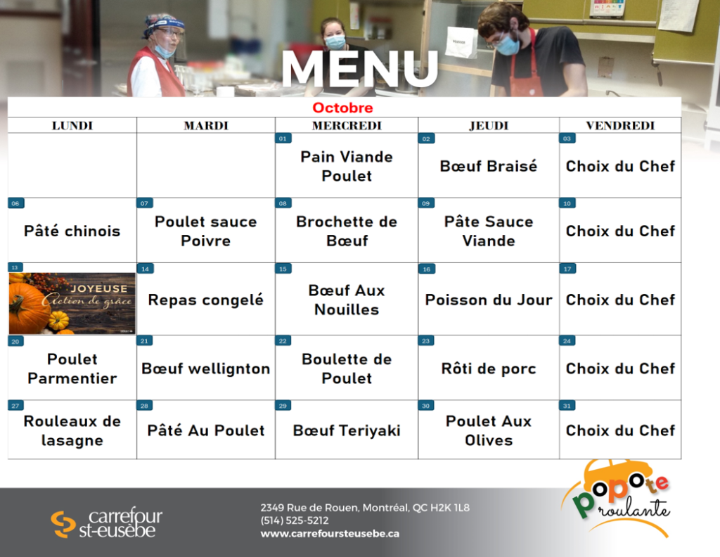 La popote roulante du Carrefour St-Eusèbe offre un service de livraison de repas frais ou congelés, équilibrés et abordables aux personnes âgées de 50 ans et plus en perte d’autonomie temporaire ou permanente, vivant avec des maladies chroniques ou des handicaps.